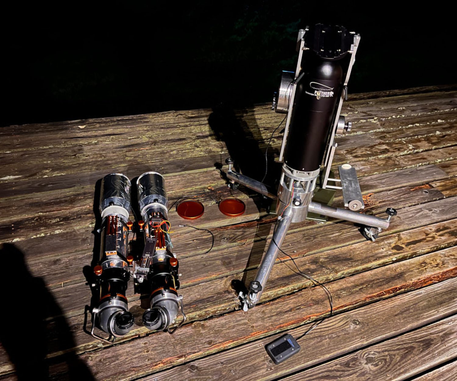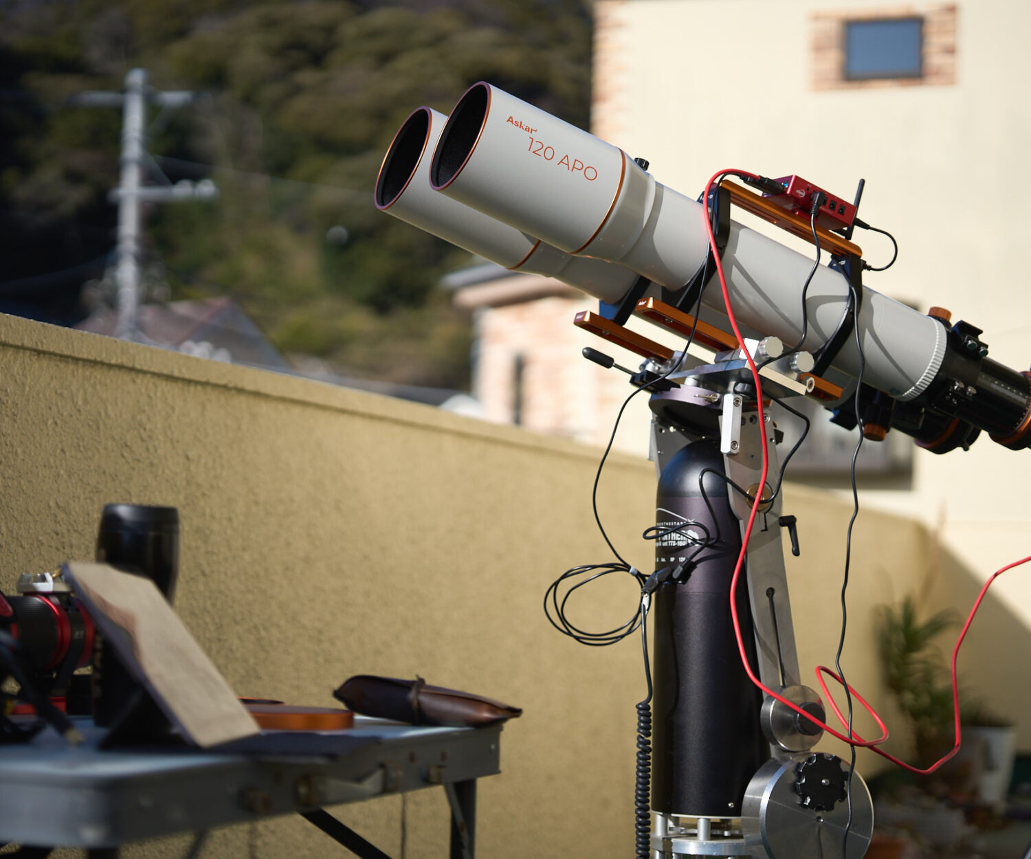 ゴトン!と8kgのバッテリー・ケースが大きな音を立てて転がり、直後にそれに勝る音を立てて、ガチャン!と120APO-BINOがスライド台座ごと地面に落下した。ケーブルで接続されていたマツモト式AAS傾斜センサーも吹き飛んだ。一瞬、思考停止、、、。